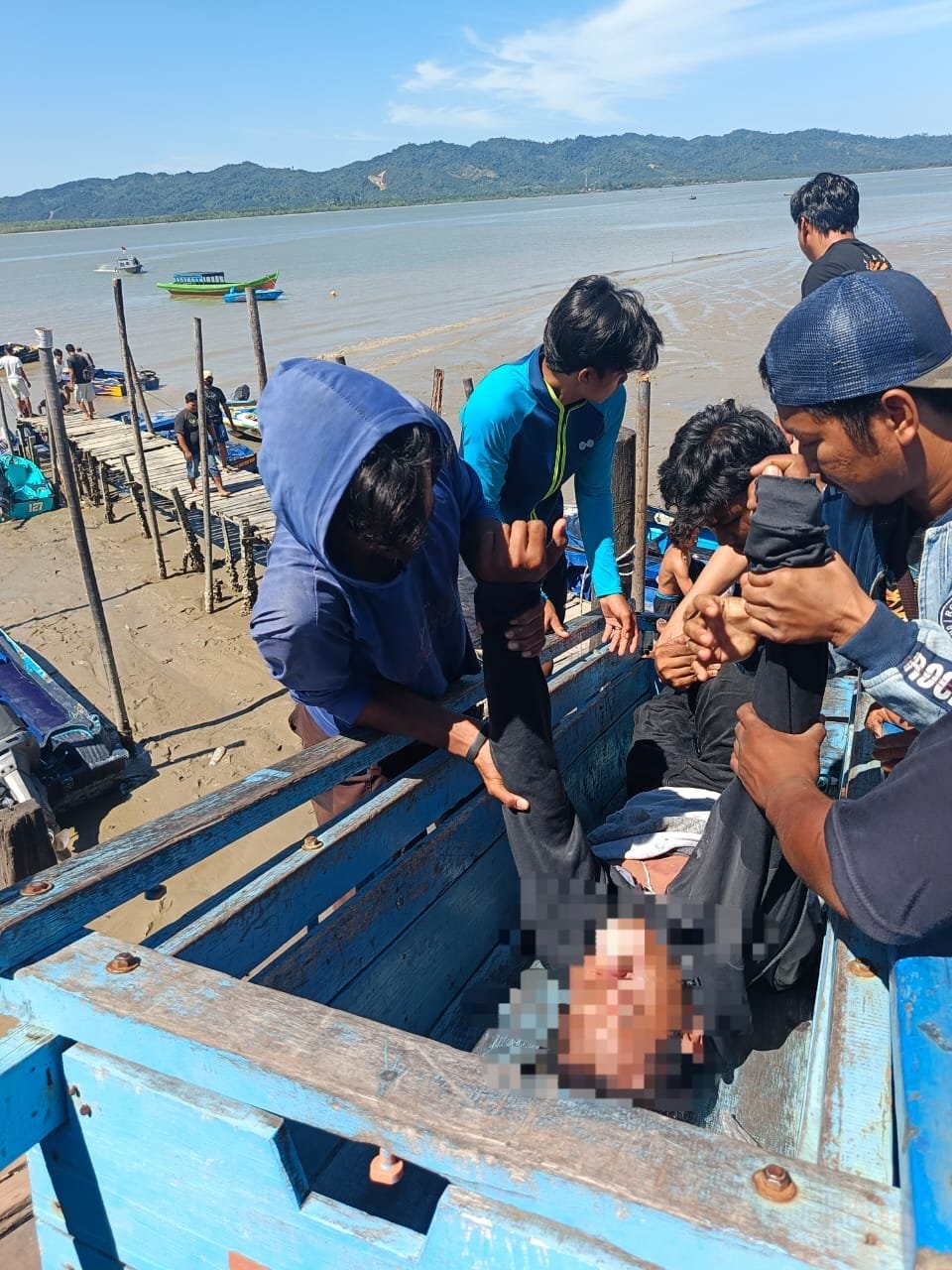 Warga membantu evakuasi motoris speed boat yang tewas dalam insiden laka laut di depan Dermaga Tradisional Haji Putri Nunukan, Senin (28/7/2025). Perbesar