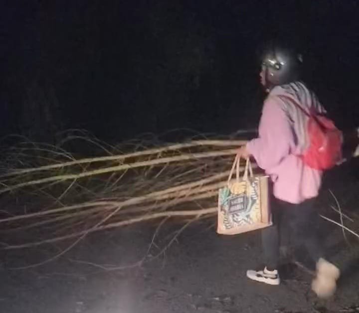 ‘’Ini kejadian tadi Subuh jam 4 yah, (29/3/2026). Kami berangkat dari Maspul ke Liang Bunyu, Pelabuhan Feri. Kami dikagetkan dengan aksi begal yang pasang ranting kayu, pohon dan buah sawit yang disusun di tengah jalan. Jadi kalau jalan sendiri ya siaplah dibegal. Tapi Alhamdulillah tadi kami ramai sekeluarga jalan dua motor, masing masing boncengan dan juga bawa mobil pikap, jadi ramai. Makanya begalnya takut keluar,’’ tulisnya.