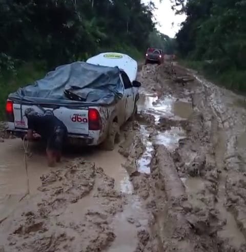 Oktafianus, mengirimkan sebuah video sejumlah mobil gardan ganda yang mengangkut Sembako, terjebak di jalanan berlumpur yang selama ini menjadi akses satu satunya di wilayah pedalaman tersebut.